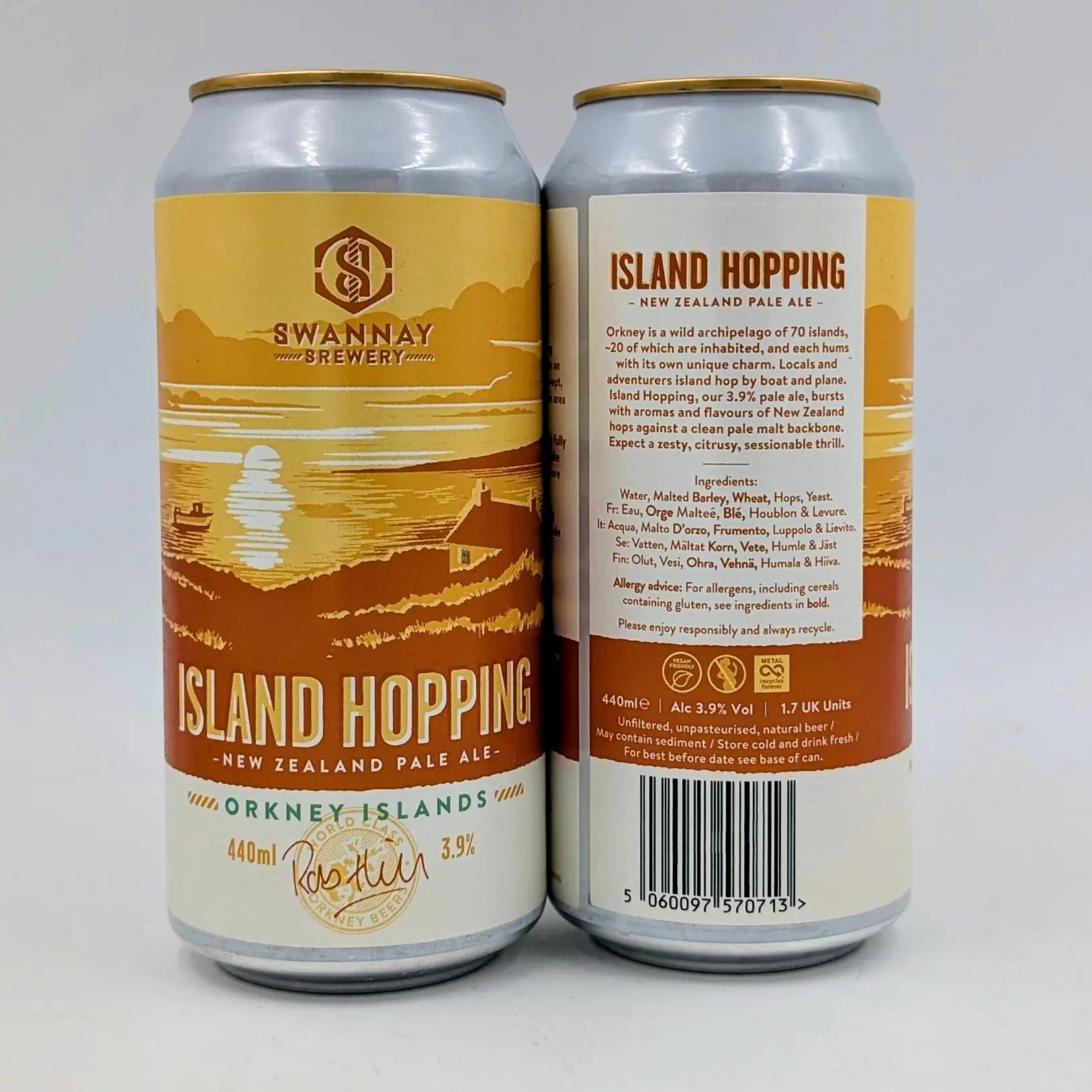 Orkney comprises of 70 islands, 17 or 18 of which are inhabited. Each unique in its own way, locals and tourists travel internally by both sea and air. We use all pale malt and lots of New Zealand hops to create this hoppy but still sessionable low strength beer.